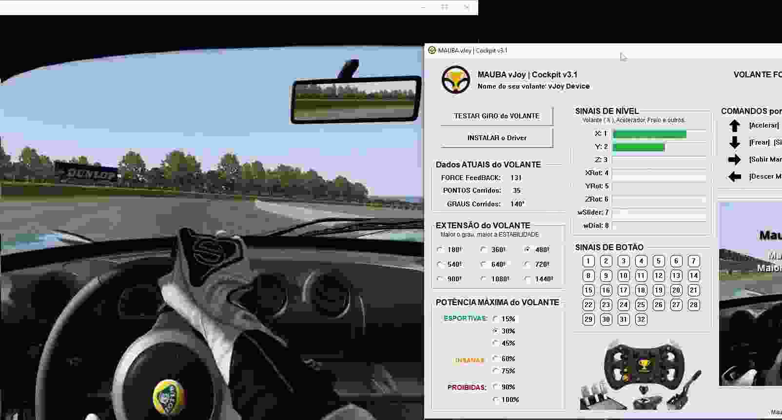 ✅ - Rode o programa "Mauba vJoy.exe" fornecido e, escolha a POTENCIA MÍNIMA para seus testes.